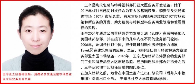 王辛 亞太區(qū)基礎(chǔ)設(shè)施、消費(fèi)品及交通運(yùn)輸市場(chǎng)總監(jiān)亞太區(qū)業(yè)務(wù)開發(fā)總監(jiān) 陶氏包裝與特種塑料業(yè)務(wù)